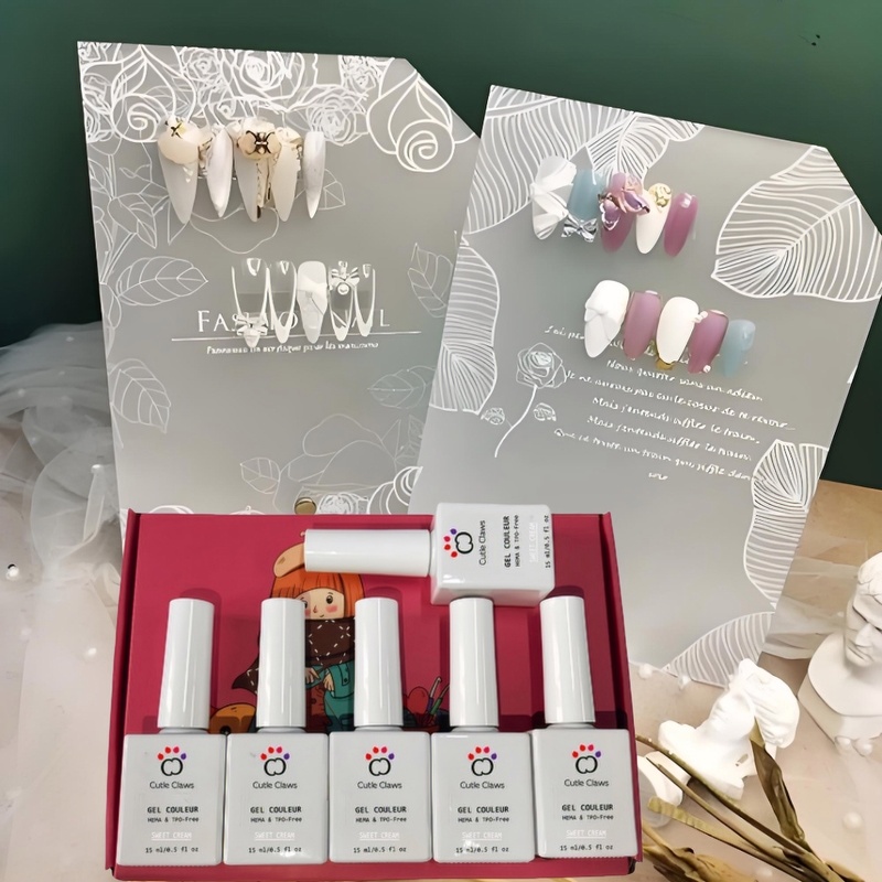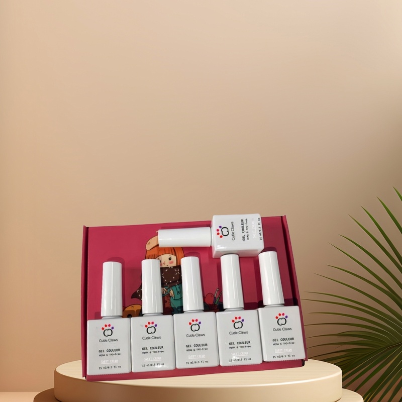 A set of six vibrant gel nail polishes offering long-lasting shine and durability. Perfect for creating salon-quality manicures at home.